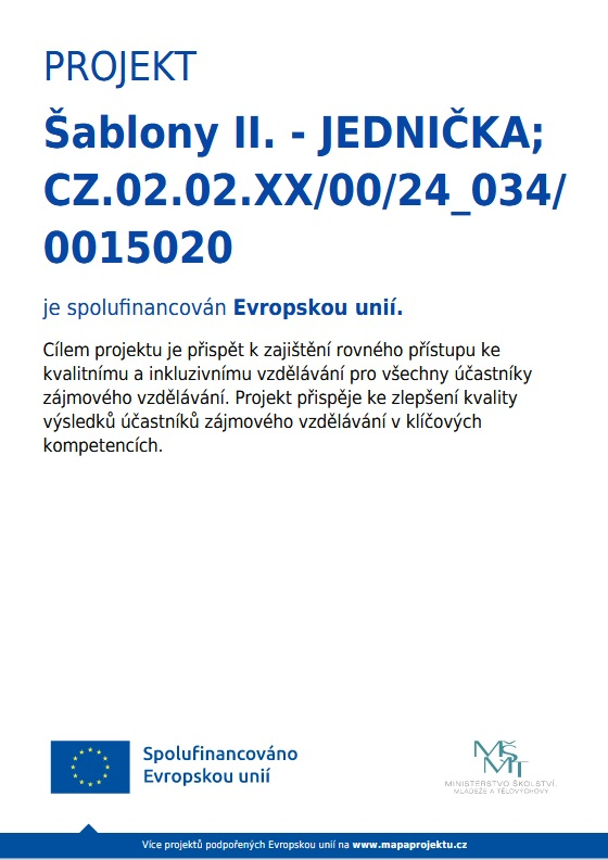 Dům dětí a mládeže Jednička se v roce 2022 – 2025 zapojuje do projektu ŠABLONY I. – JEDNIČKA v rámci OP VVV prostřednictvím výzvy výzvy č. 02_22_002 – OP JAK – Šablony I. Registrační číslo projektu CZ.02.02.XX/00/22_002/0002195